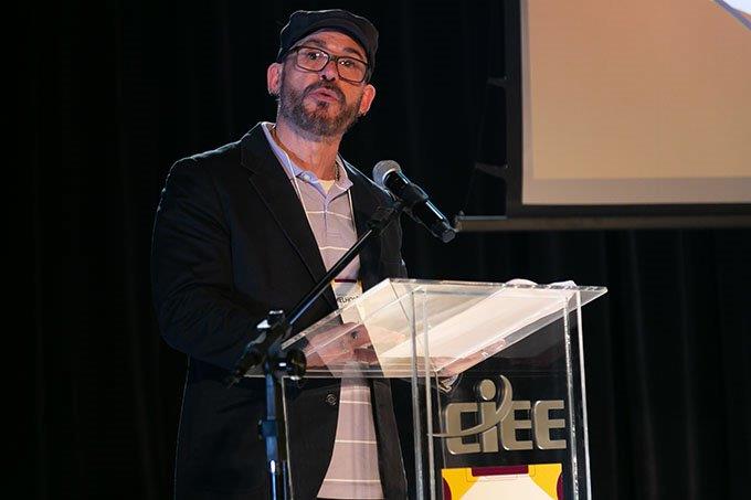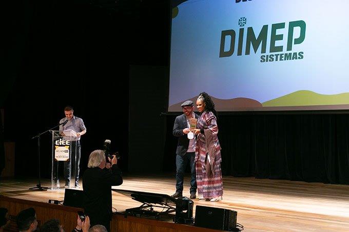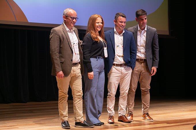 Alguns dos premiados, com seus troféus, participam de foto no palco